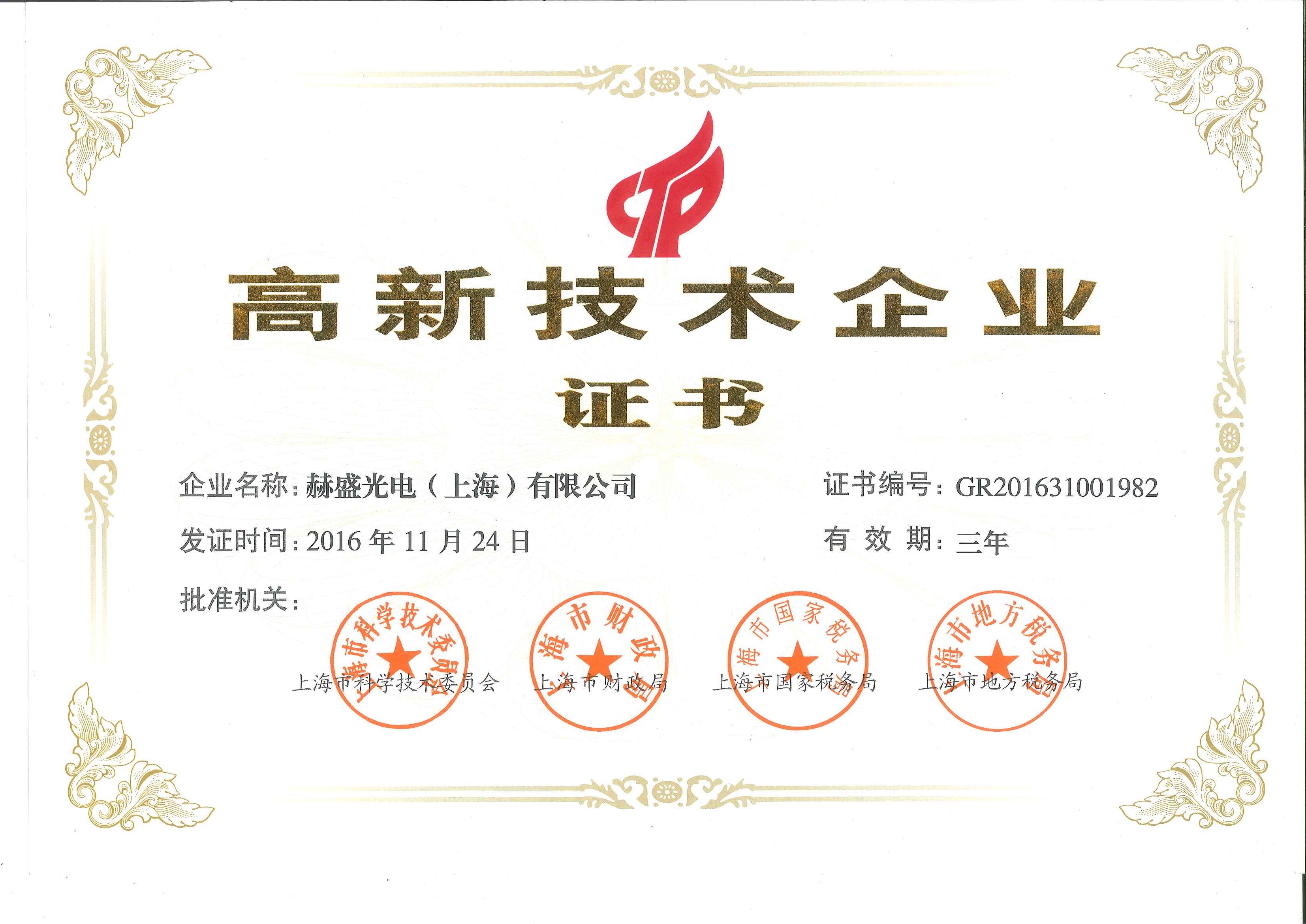 2019年11月,赫盛光電經(jīng)嚴(yán)格的測(cè)評(píng)和審批流程,憑借雄厚的技術(shù)實(shí)力通過(guò)層層審核,公司獲得 “國(guó)家高新技術(shù)企業(yè)”復(fù)審。